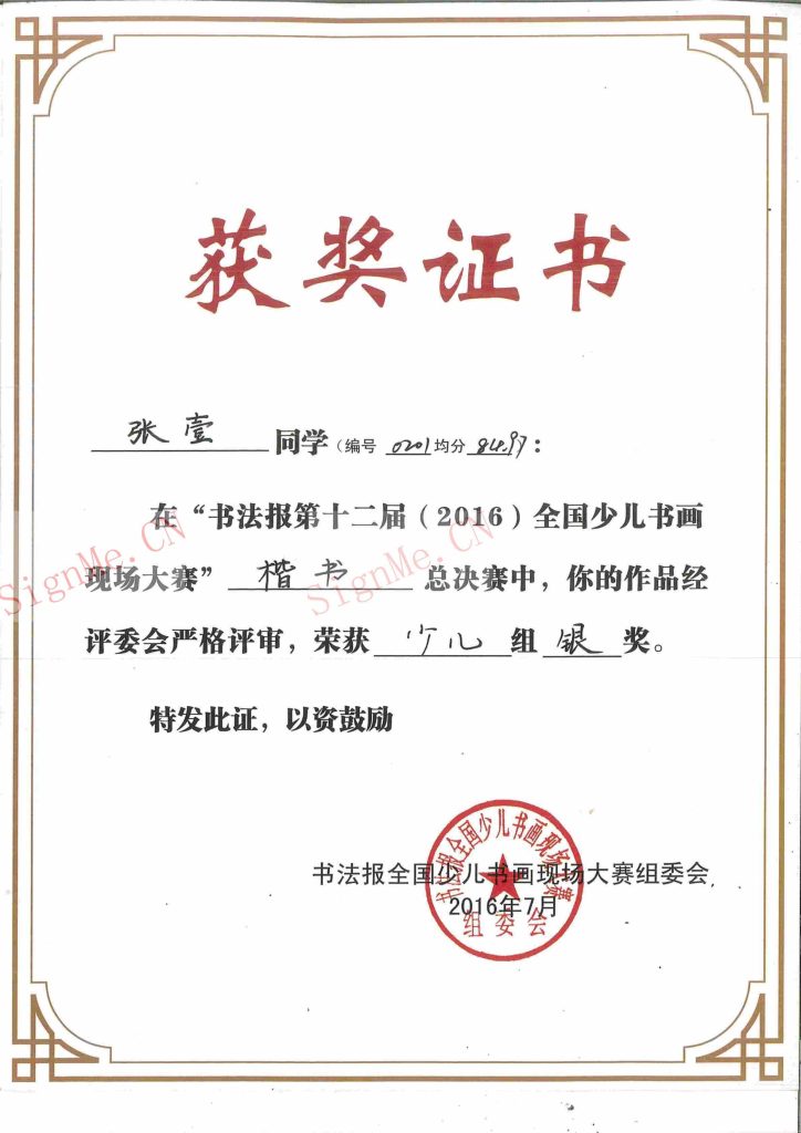 书法报第十二届(2016)全国少儿书画现场大赛 楷书 少儿组 银奖