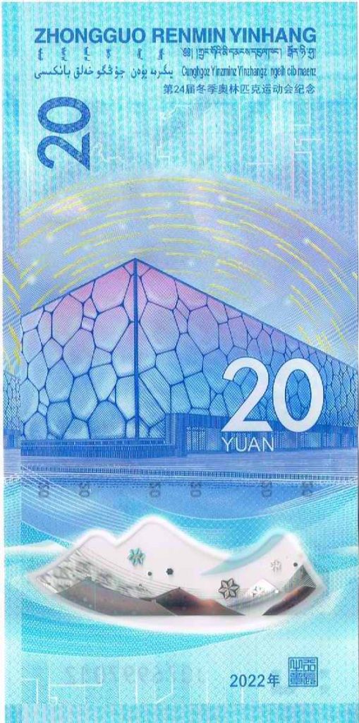 冰上运动项目纪念钞背面主景为第24届冬季奥林匹克运动会竞赛场馆“冰立方”图案,上方为“中国人民银行”汉语拼音,蒙、藏、维、壮4种民族文字的“中国人民银行”字样及面额,“第24届冬季奥林匹克运动会纪念”和面额数字“20”,右侧为面额数字“20”、汉语拼音字母“YUAN”,下方为年号“2022年”和行长章。