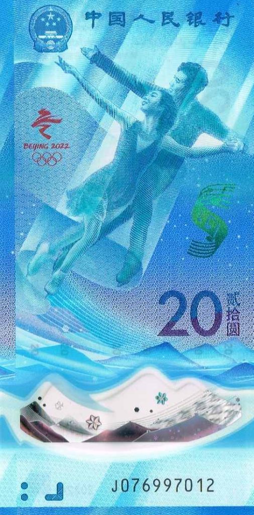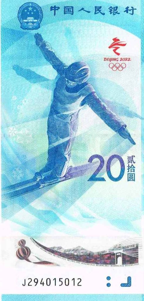 雪上运动项目纪念钞正面主景为自由式滑雪运动员图案,上方为中华人民共和国国徽、“中国人民银行”行名,右侧为第24届冬季奥林匹克运动会会徽、面额数字“20”与汉字“贰拾圆”,下方为动感全息图案、盲文面额标记和冠字号码。