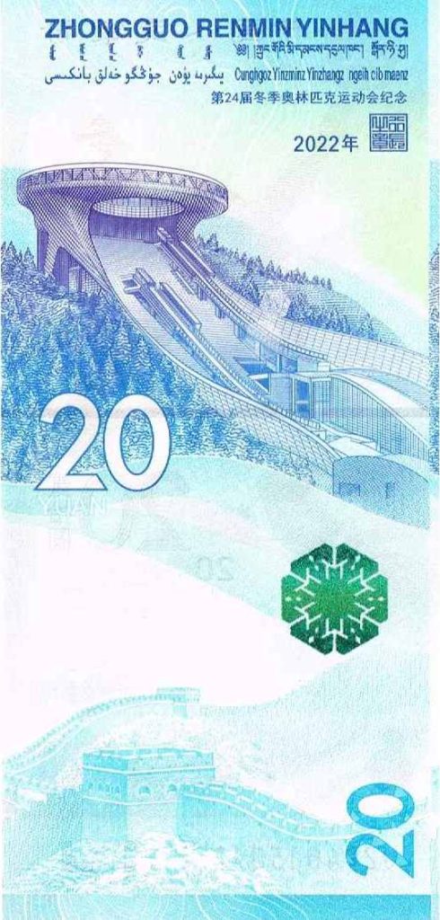 雪上运动项目纪念钞背面主景为第24届冬季奥林匹克运动会竞赛场馆“雪如意”图案,上方为“中国人民银行”汉语拼音,蒙、藏、维、壮4种民族文字的“中国人民银行”字样及面额,“第24届冬季奥林匹克运动会纪念”、年号“2022年”和行长章,左侧为面额数字“20”、汉语拼音字母“YUAN”,下方为光彩光变雪花图案、雪山长城图案与面额数字“20”。