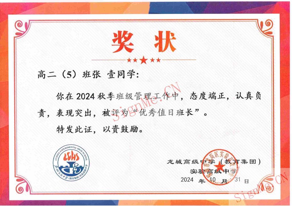 2024 龙城高级中学(教育集团)实验高级中学高二 优秀值日班长